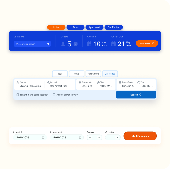Let users find hotels, tours, rentals, or cars with ease—your search adapts to what you offer.