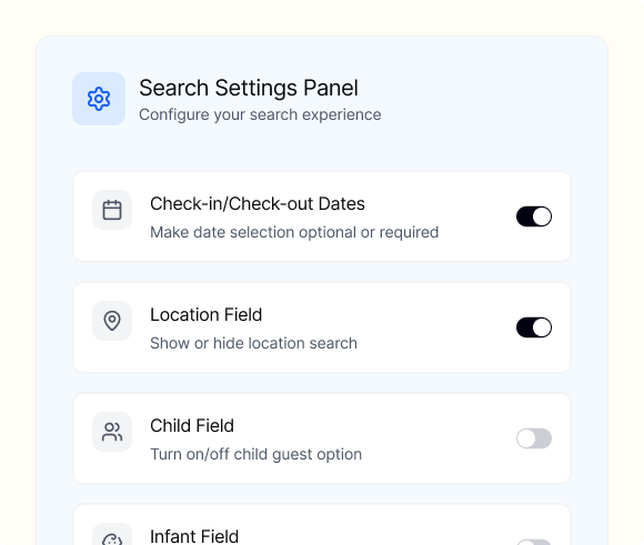 Customize each search field—date, child, infant, location—using quick toggles. You decide what users see.