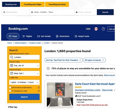 With the Booking.com integration, your site can show hotel listings directly in the search results. Users can browse in a popup, and clicking a hotel redirects them to Booking.com. If they book, you earn a commission.