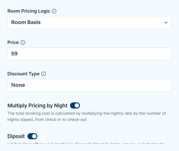You set one nightly rate per room type, and the system auto-calculates the total based on nights. It’s ideal for hotels with standard nightly pricing.
