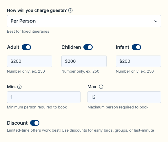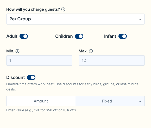 Per Person means you charge each guest individually (adult/child/infant). Per Group means you set one rate for the entire group and define how many people that covers.