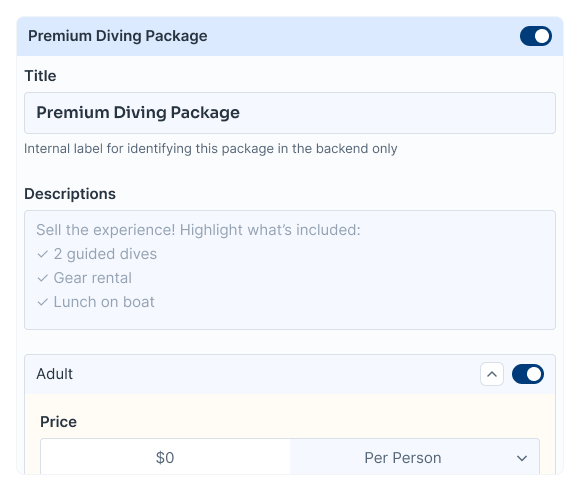 Use Package if you want to define a named offering (e.g. “Weekend Family Pack”) and then choose how you charge—per person or per group. If you prefer straightforward per person or per group, you can skip naming a “package.”