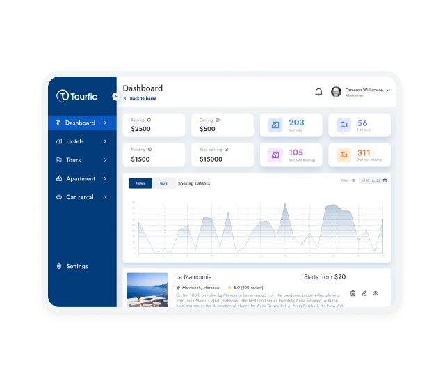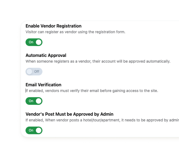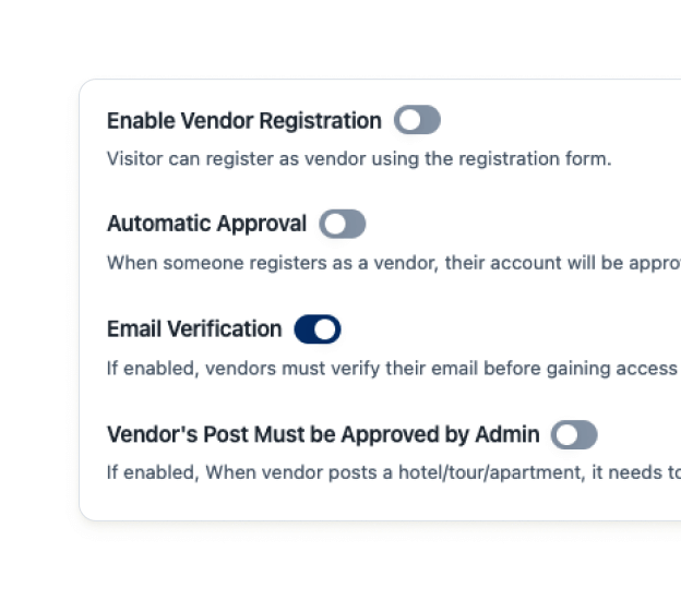 With Tourfic, vendors can manage rooms, tours, rentals, bookings, and earnings independently—making your multivendor platform fast, organized, and scalable.