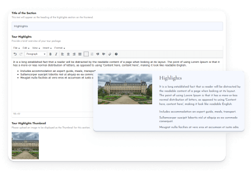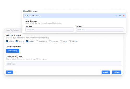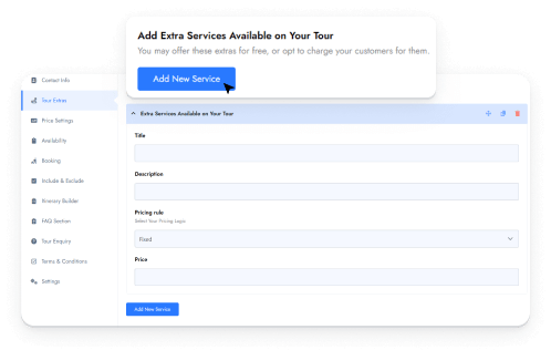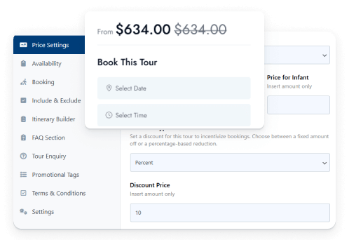 You can define pricing per person or per group, include add-ons (airport pick-ups, guide fees, meals), and set up early-bird or seasonal discounts. Tourfic ensures accurate pricing for every booking scenario.