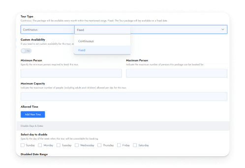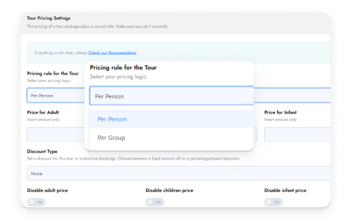 Yes! Tourfic allows conditional pricing based on person type (adult, child, infant), group size, or selected extras. You can also set package pricing for fixed group tours or private packages, making it easy to offer flexible rate options.